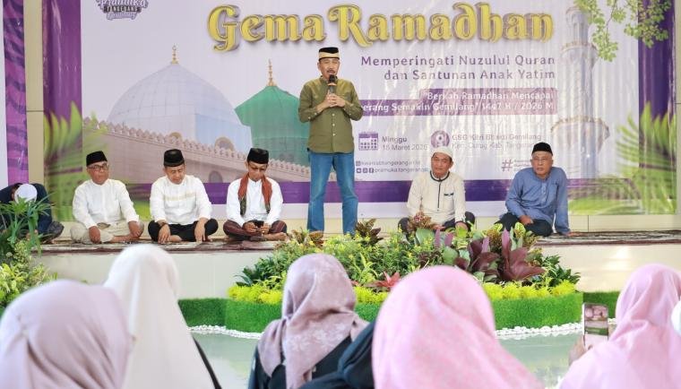 Asisten Daerah Bidang Perekonomian dan Pembangunan Kabupaten Tangerang, Syaifullah, menghadiri kegiatan Gema Ramadan dalam rangka memperingati Nuzulul Quran dan santunan anak yatim yang digelar di GSG Kitri Bhakti Gemilang, Kecamatan Curug, Minggu (15/3/2026).