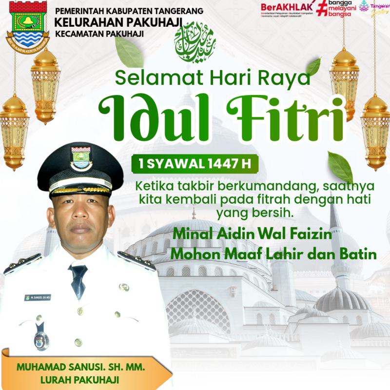 KABUPATEN TANGERANG, ONLINEPANTURA.COM – Selamat Hari Raya Idul Fitri 1447 Hijriah/2026 Masehi, Muhamad Sanusi. SH. MM. Lurah Pakuhaji Kabupaten Tangerang mengajak masyarakat khususnya di Kecamatan Pakuhaji untuk meningkatkan Ketaqwaan dan mempererat kebersamaan di Hari Idul Fitri 1447 Hijriah.