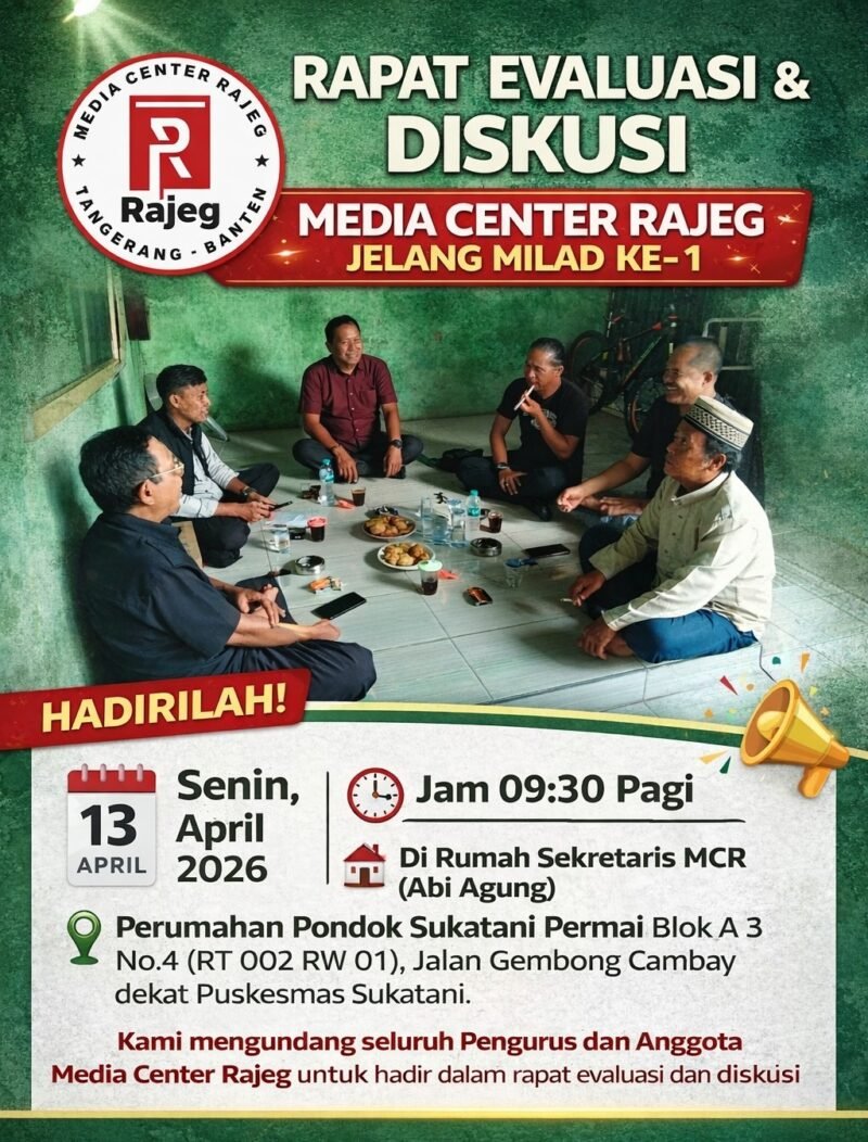 KABUPATEN TANGERANG, ONLINEPANTURA.COM – Media Center Rajeg (MCR) menggelar Rapat Evaluasi dan Diskusi pengurus, kegiatan tersebut digelar di kediaman Sekertaris MCR (Abi Agung), Perumahan Pondok Sukatani Permai Blok A 3 No.4 RT 002 RW 01 Jalan Gembong Cambay Kelurahan Sukatani Kecamatan Rajeg Kabupaten Tangerang, Senin (13/04/2026).