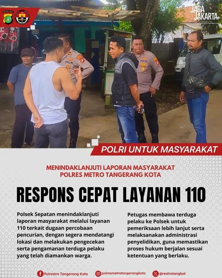 Polsek Sepatan mengimbau masyarakat untuk tetap menjaga situasi kamtibmas serta segera melaporkan setiap kejadian kriminalitas maupun gangguan keamanan melalui layanan darurat 110 agar dapat ditangani secara cepat, profesional, dan humanis.