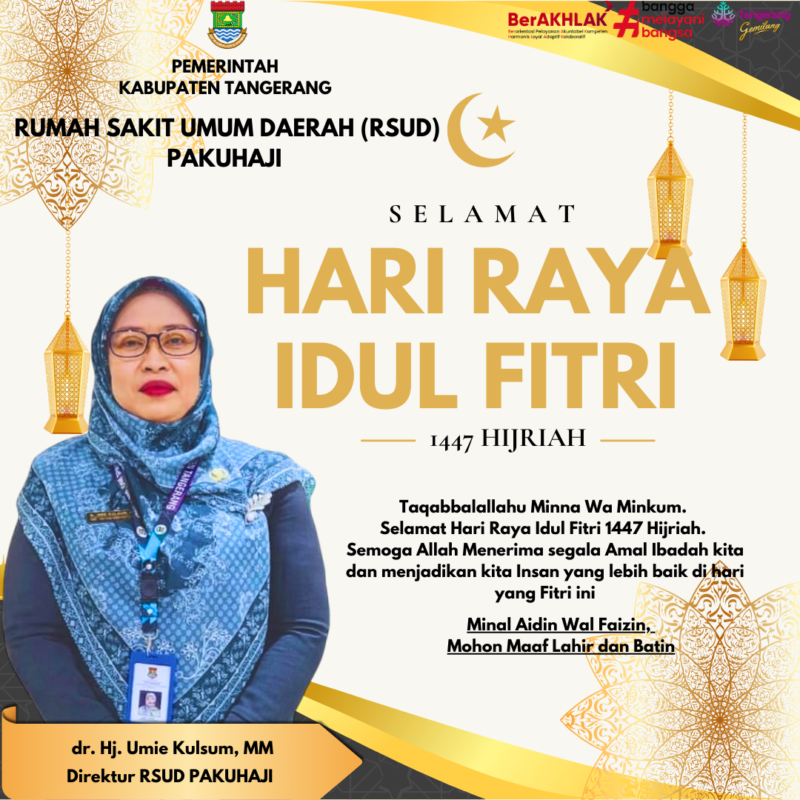 KABUPATEN TANGERANG, ONLINEPANTURA.COM – Selamat Hari Raya Idul Fitri 1447 Hijriah/2026 Masehi, Direktur Rumah Sakit Umum Daerah (RSUD) Pakuhaji Kabupaten Tangerang Provinsi Banten dr. Hj. Umie Kulsum, MM mengajak masyarakat khususnya Kabupaten Tangerang untuk meningkatkan Ketaqwaan dan mempererat kebersamaan di Hari Idul Fitri 1447 Hijriah.